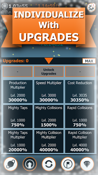 • Upgrade all of your objects in various ways! You will be given multiple options to choose from and you can make your universe unique to you!