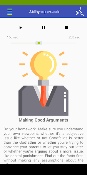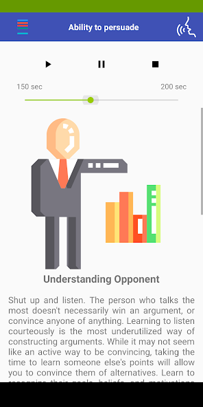 このモバイルアプリを使用すると、説得力のあるコミュニケーションの原則と、目標を達成するためにそれらを適用する方法を学びます。説得力のあるメッセージの作成から、社会的証拠、不足、権威などの説得力のあるテクニックの使用まで、このアプリはそれをすべてカバーしています。