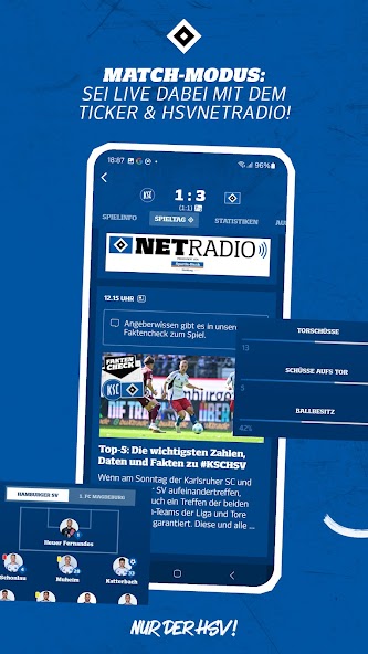 「マッチデイ」では、マッチデイモードでは、最も重要なニュース、ラインナップ、調査、ライブ統計が提供されます。また、ライブティッカーまたはHSVNetradioでゲームを間近でフォローすることもでき、重要なシーンを見逃さないことを保証することもできます。