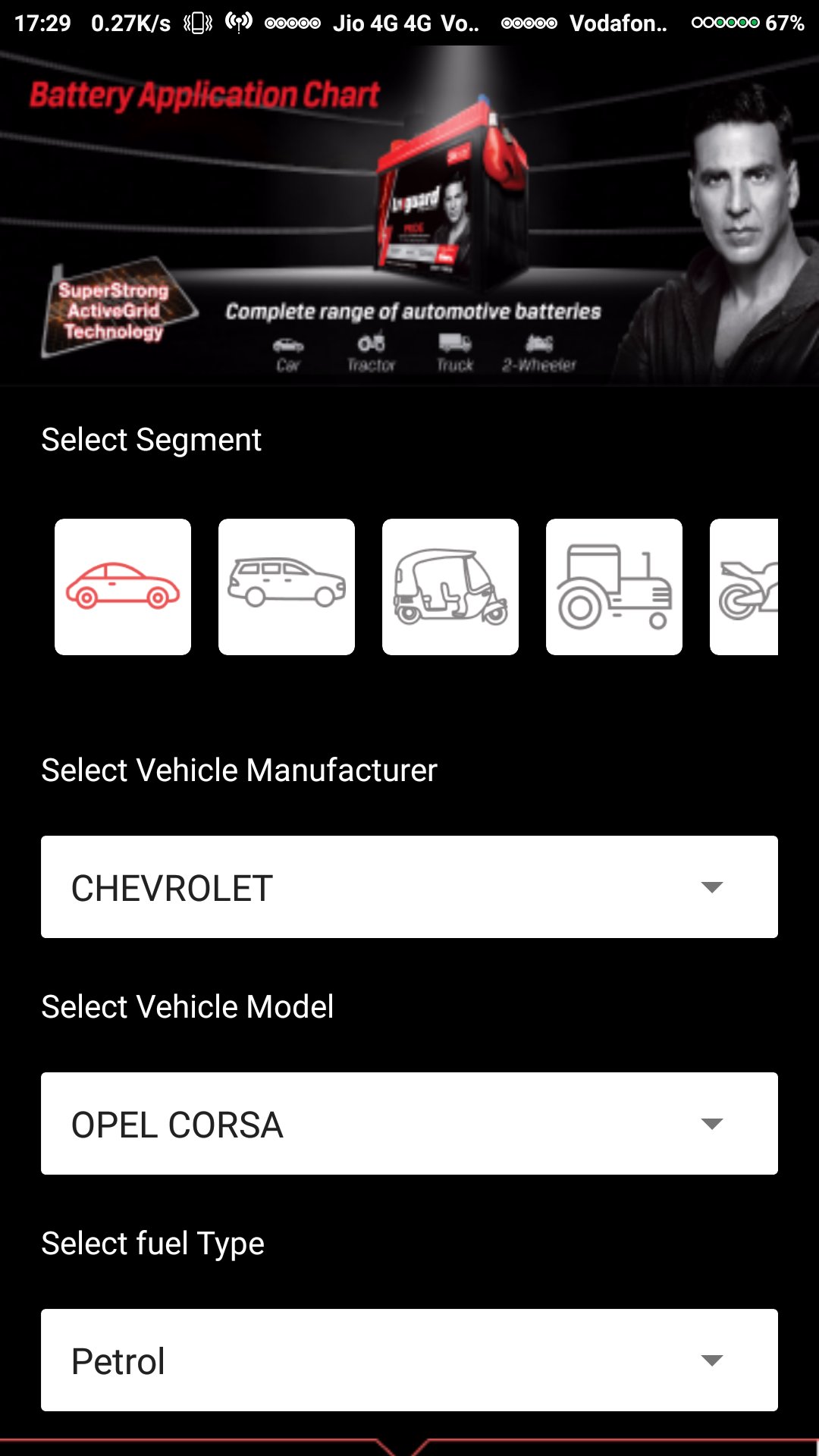 2) 推奨事項 : ユーザーは車両セグメント、メーカー、モデル、燃料の種類に応じて車両を選択できます。次に、アプリはその車両に適したバッテリーのモデルを通知します。
