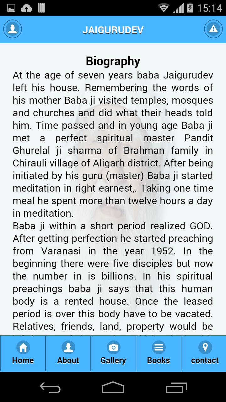 This great Powerful Saint Baba Jai Gurudev has been preaching for upliftment of soul through his religious discourses under the name of "JAI GURUDEV" which is the name of God. This Great Saint attributes the present state of humanity to the five-fold inner weaknesses of man : i.e. lust, anger, greed, attachment and egoism. The Saint is therefore busy day by day in what He calls "The reconstruction of the real temple - Human Body", a job which only a great powerful Saint can do.