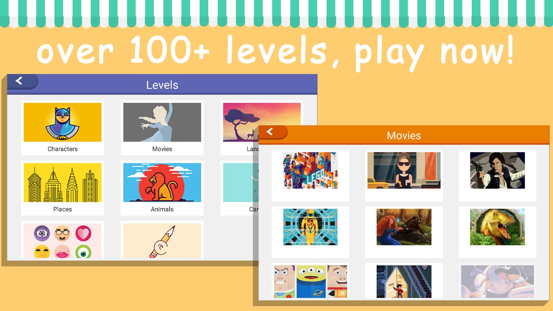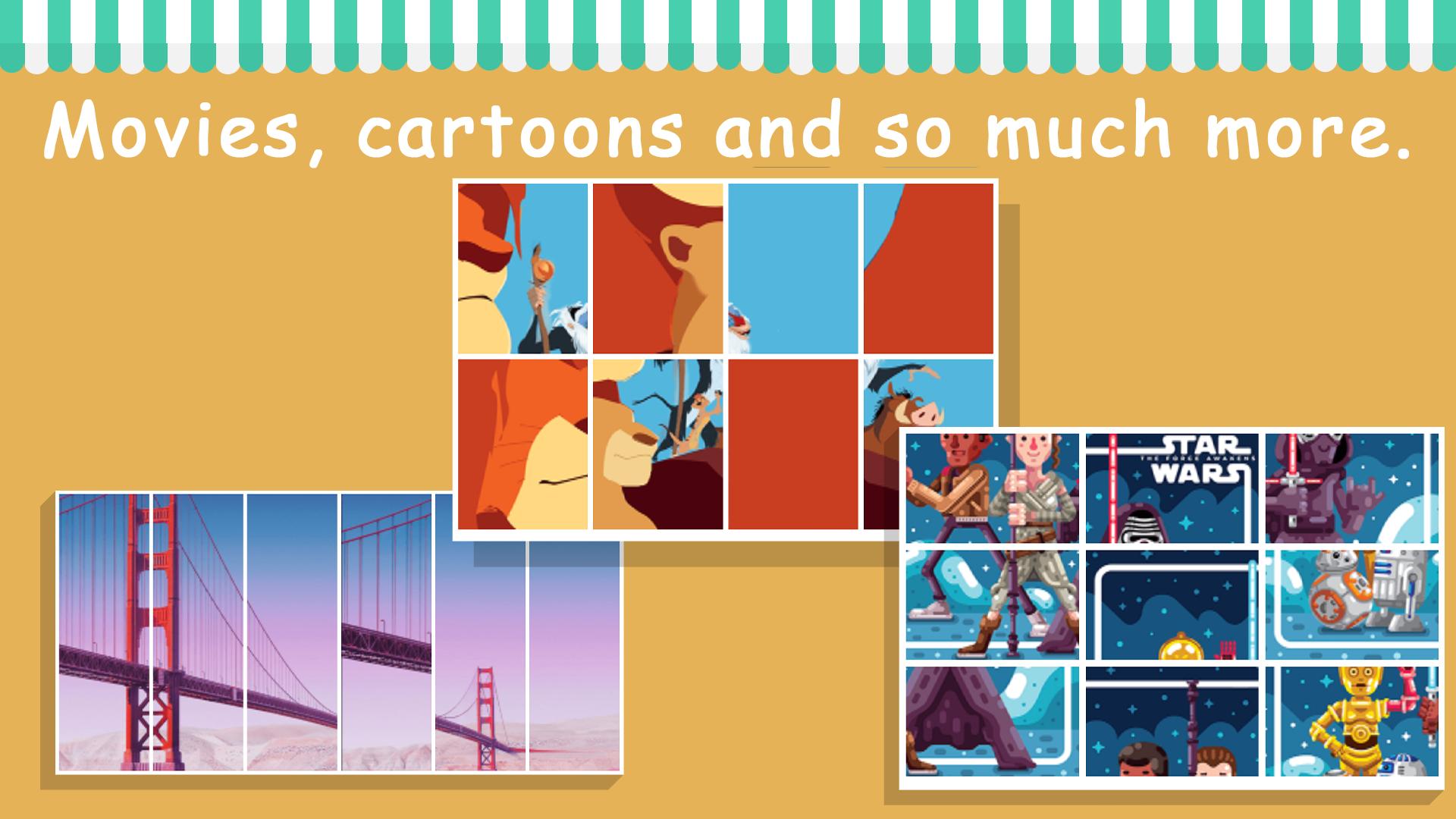 Huge collection of levels! Movies, comics, cartoons, superhero, drawings, animals, places and much much more!