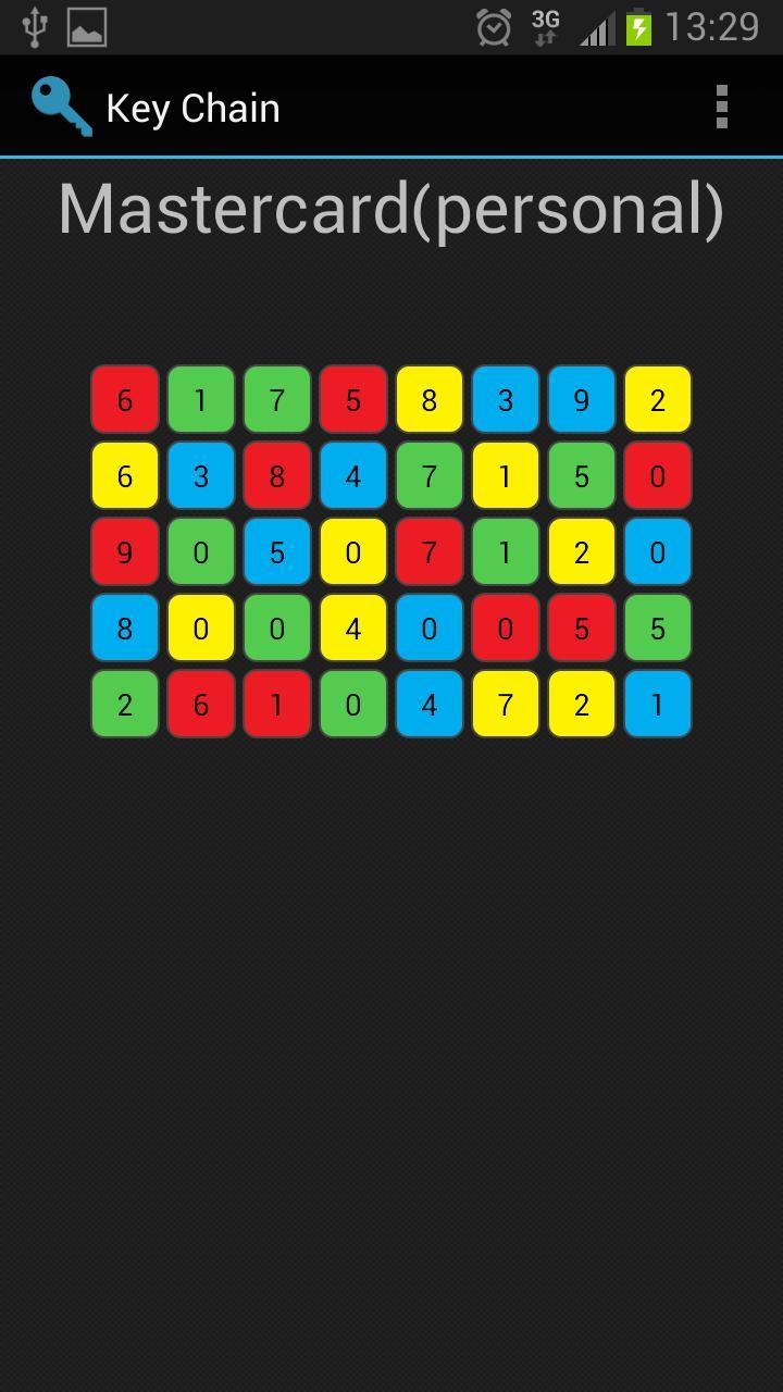 Tired of remembering your pincodes and passwords? Let Key Chain handle that! Only thing you need to remember is which four squares contains your code. Same goes with the password. Pick the squares in which your password should reside. Come up with a way you can remember the sequence, be it either prime numbers, fibonacci numbers or just starting at square 4 and go down until your password ends.