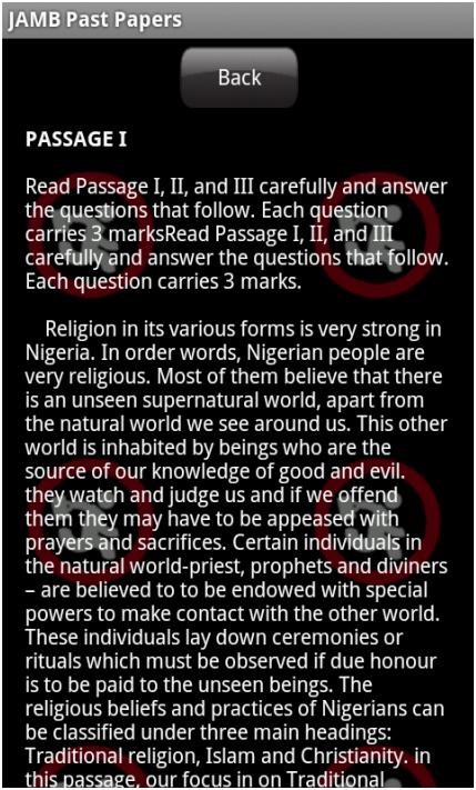 공동 입학 및 수학위원회의 JAMB 시험의 공식 과거 논문의 이러한 수집 및 향후 릴리스는 다양한 3 차 기관에 입학을 원하는 학생들을위한 준비 및 개정을위한 도구 역할을하여 지속적인 인터넷 연결 또는 휴대폰 크레딧의 두통없이 오프라인 앱의 수많은 이점을 누리게됩니다.