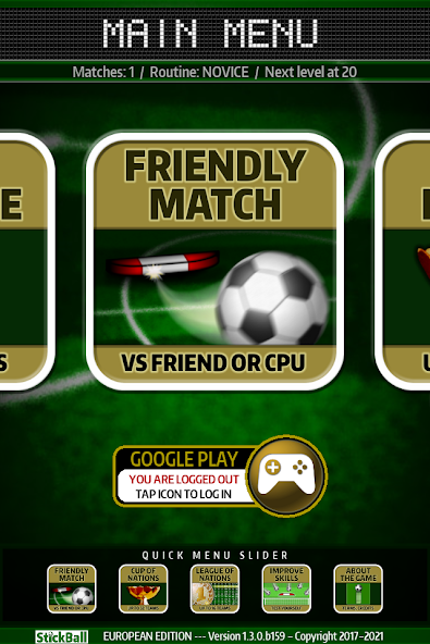 - 선택적인 추가 시간 및 페널티 슛 아웃을 통해 다른 플레이어 또는 CPU와의 친숙한 경기.