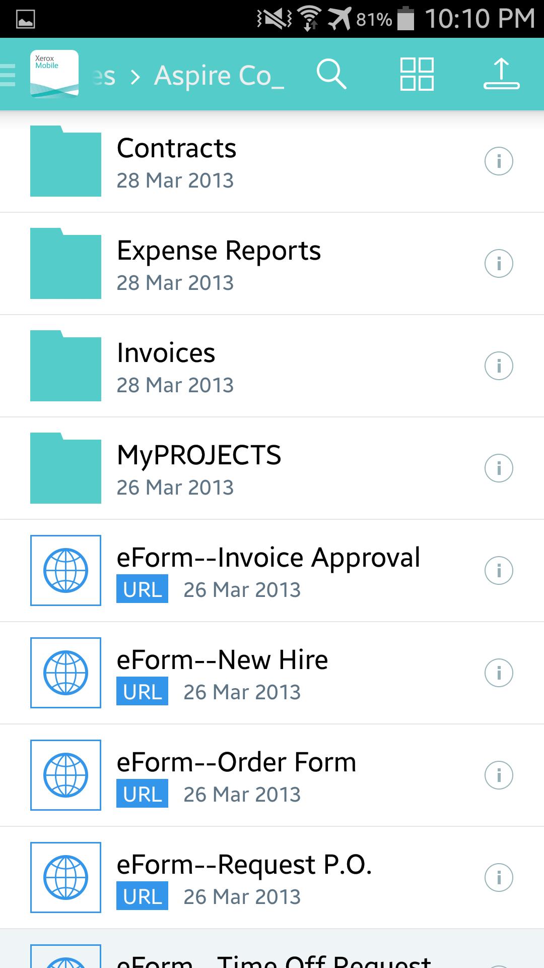 DocUshare 용 Xerox Mobile Client open in Xerox® Mobile Print®와 같은 애플리케이션에 대한 액세스를 제공하는 Open 기능을 제공하여 이동 중에 문서를 인쇄 할 수 있으므로 사무실에서와 같이 도로에서 효율적입니다.