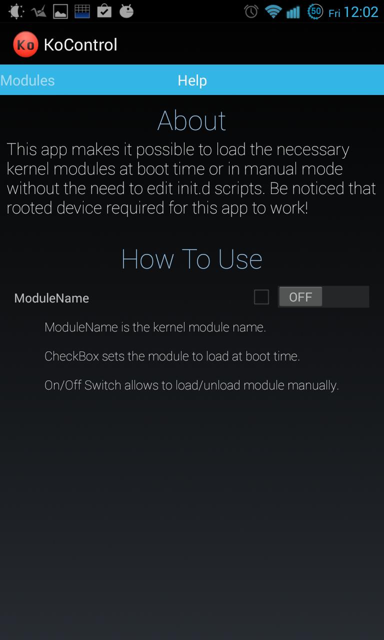 KoControl makes it possible to load desired kernel modules at boot time or in manual mode without the need to edit init scripts. Useful for custom roms with custom kernels. Warning!! Rooted device required for this app to work!!