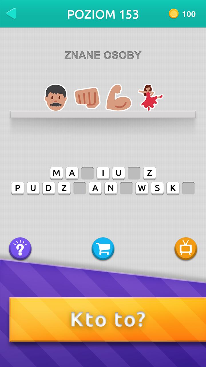 The new Polish play of the creators of 96% and guess what it is or fortunes all the time. This time your task is to solve the puzzles presented in emoticons. At first, the guesses put before you are simple, but over time they become more difficult and more demanding. Over 400 rebuses grouped in several categories are waiting for you (including sport, film, books, famous brands, music, animated films, television, famous people).