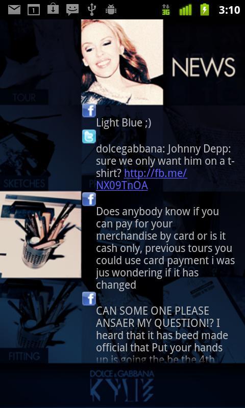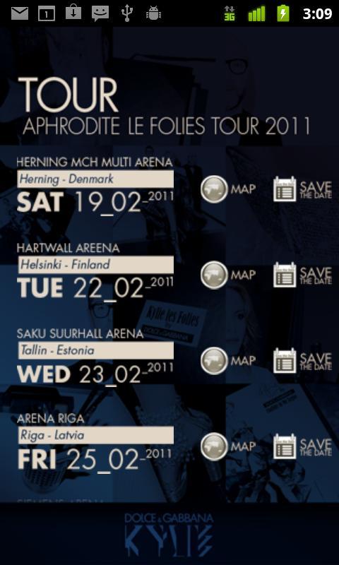 Get in touch with Kylie, the star is now at your fingertips and her worldwide tour is directly reported to you. You are just a few steps away from: discovering the stage wardrobe Dolce&Gabbana has created for Kylie Minogue’s "Les Folies Tour", following your star by keeping up to date with her latest news, getting inside her fitting room with Domenico Dolce and Stefano Gabbana... And much more. A new mobile experience for a unique, collective happening of music, dance and fashion.