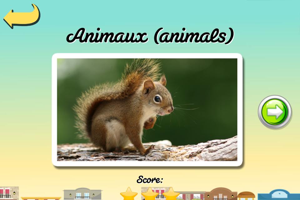 Choose from twelve different word categories, including: animals, school, outdoors, tools, transportation, vegetables, positions, movement, music, shapes, and sports. Select the correct picture from four (or two, if four is too difficult) flashcard images based on the French word that is spoken. To assist with your choices, you also have the option of hearing the English version of the words. Stars are awarded at the end of each game based on the number of correct and incorrect answers you made. Try to master all 12 word categories by getting a perfect 3 stars in every category.