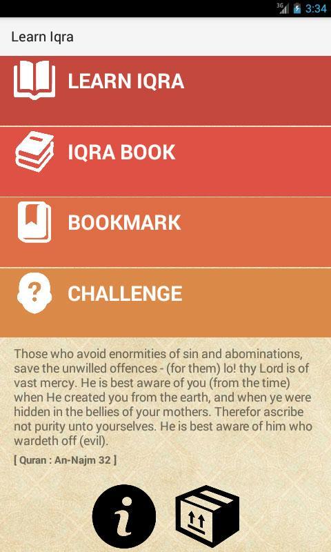 Learn to read Quran more easier, study anywhere and anytime using Iqra or Iqro method. Learn Iqra is a free application to help learn how to read Quran in easier way start with an introduction to Arabic letter Hijaiyah. Just relax and follow the step to learn read Arabic letter and word. Practice regulary and you will know that read Quran is not difficult.
