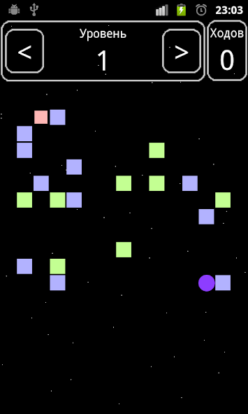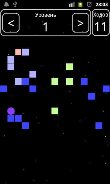 The ball flies while doesn't meet an obstacle. Obstacles: blue blocks, at collision with which the ball stops, and green blocks - after collision the ball flies by on one position, shifting the block in the same direction. After visit of all blue blocks the portal - an exit from level opens.
