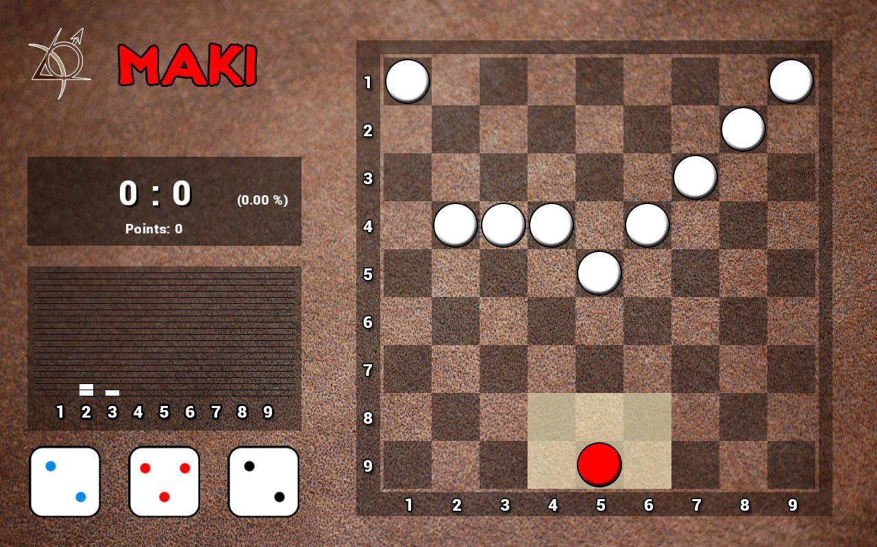 A free board game using Miwin's Dice, invented in 1975 by the physicist Michael Winkelmann in Vienna. The goal of the game is to reach the opposite side of the board.