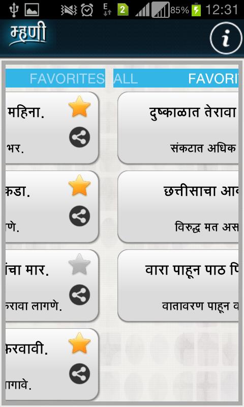 In each language there are specific wordings or sentences which can not be translated in other language but they have great meaning, such wordings or sentences are called as phrases. In Marathi language these phrases are called as "Mhani [ म्हणी ] ". These phrases are used in different ways for different significance. In Marathi language there is largest collection of phrases [मराठी म्हणी]. So we are providing you all these list of phrases [मराठी म्हणी] with their meaning in Marathi Mhani App in uni-code Devanagari format . You can see any phrase from the list and check it's meaning by just one click. This easy to use app provides you the facility to add phrase in favorite list. Also you can share any phrase through social applications. So lets enjoy the beauty of Marathi Mhani!