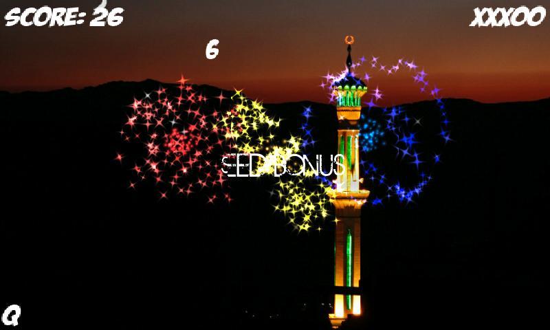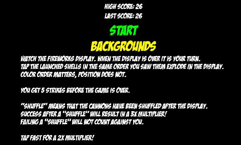 Watch the firework display. When the display is over it is your turn. Tap the launched shells in the same color order that you saw them explode in the display. The color of the shell matters, the position of the shell does NOT.