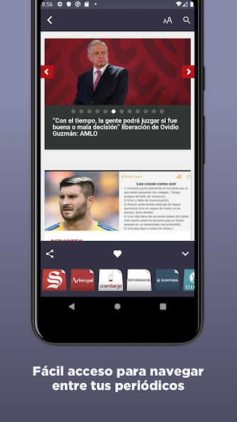 Newspapers are categorized and grouped for better navigation. In this way, you can read el universal and, from this one, you can move to other newspapers of the same category (la jornada or el debate) by moving up the lower menu. You are going to be able to compare how different newspapers analyze the same news. You can also find important regional newspapers such as el silgo de torreón or aristegui in the "Regional" category. We also have financial and political sections (you can read these news at expansión or forbes) and, sports fans have la afición and medio tiempo. Fashion magazines could not be missing to be updated on the latest trends, in tv notas, el gráfico and caras. You can read everything about with celebrities. Additionally for your convenience you can look through many other newspapers in each section.