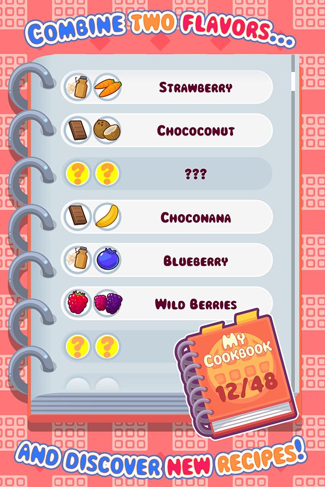 Mix flavors and create unique waffles! Go CHOCONANAS mixing and matching! Combine two flavors and discover new recipes to add to your recipe book – you have to keep guessing and trying out new things so you can get them right and complete your book of delights!