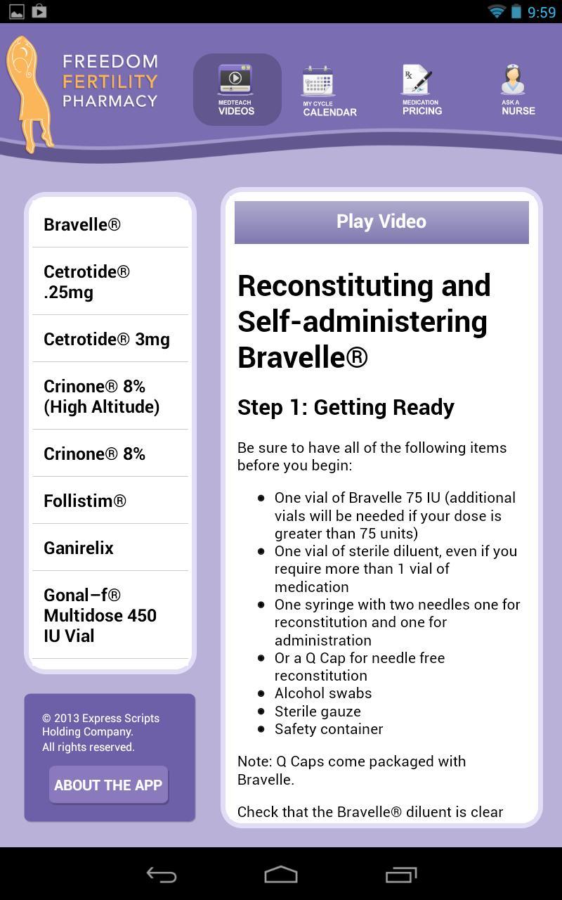 Freedom Fertility Pharmacy offers peace of mind on-the-go! Nervous about your next injection? Get instant access to Freedom MedTEACH medication injection training videos. Have questions about your fertility medications? Send a message to a dedicated Freedom Fertility nurse NOW! If you need a way to keep track of your cycle, let us organize your “fertility life” with our cycle calendar. Get the latest medication pricing information from our pricing tool. The MyFertility app from Freedom Fertility Pharmacy gives you the tools you need most anytime, anywhere.