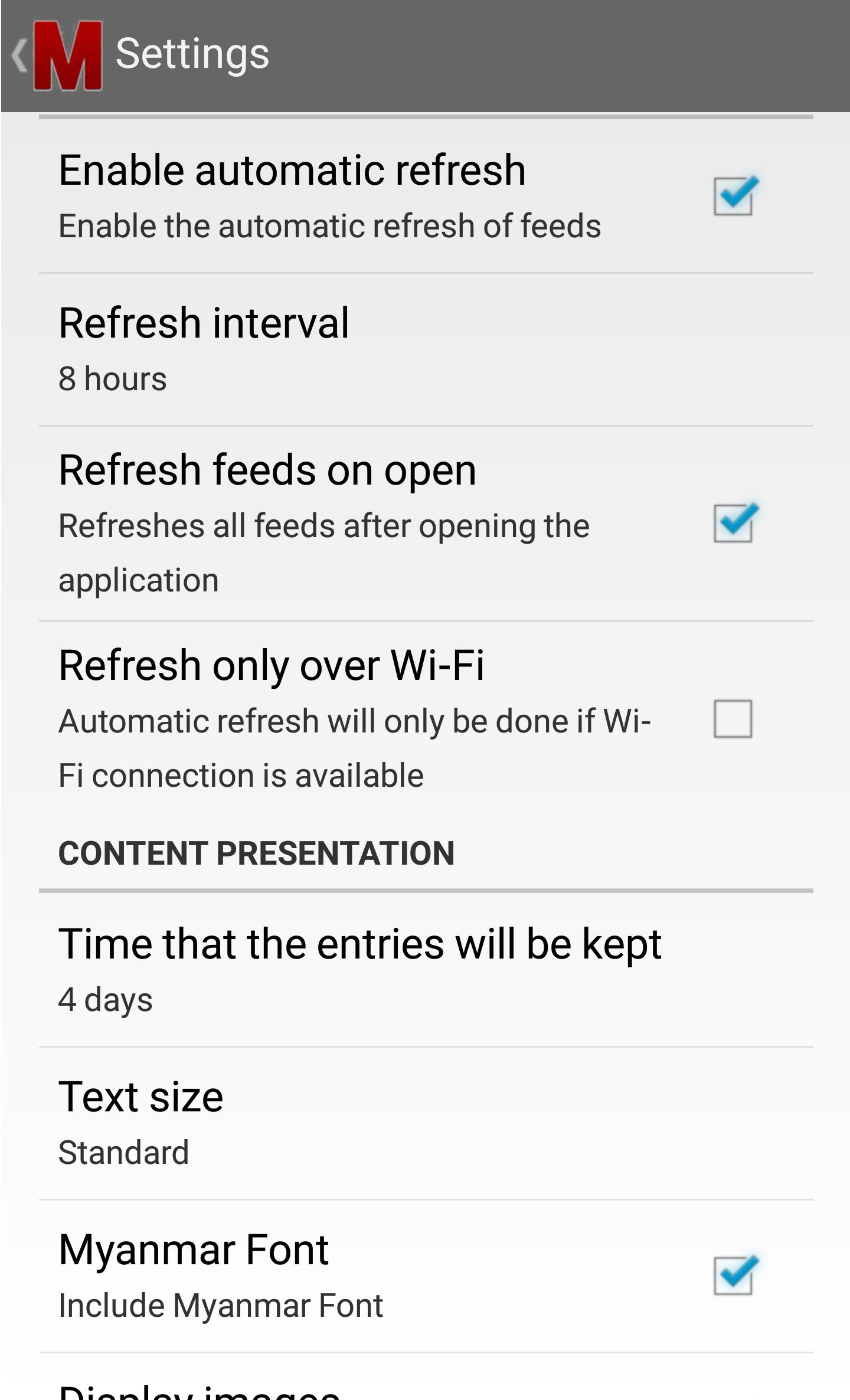 This is a feed reader app for the news from M-Media. The app will fetch the latest news feeds from http://www.m-mediagroup.com/, you can select news in both English and Myanmar language. It allows users to save the articles and favorite items inside the phone for offline reading. Myanmar font is embedded inside the app.