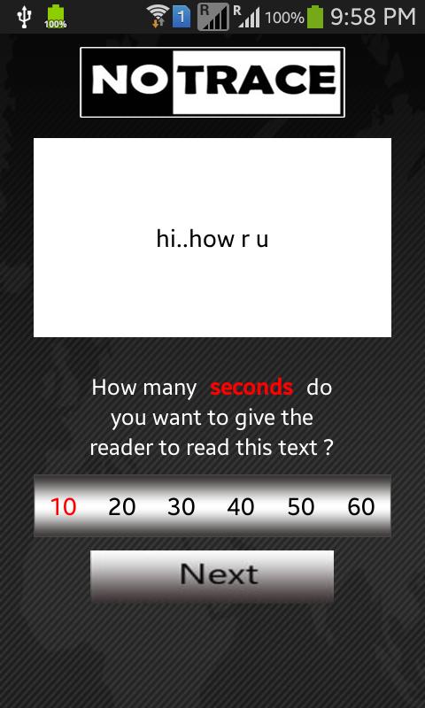 Notrace restores your liberty, it tells the spies that you don't want them looking into your private communications, it restores confidence in privacy, it brings a little relief to the soul to know that what you text will only be read by the person you intend to read it, after that it's gone forever.
