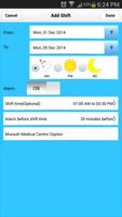 The shift planners allow you to easily enter in all your upcoming shifts with simple icons that also allow for regular and irregular shift times, the name of the facility and the ability to set reminders or alarms for these shifts.