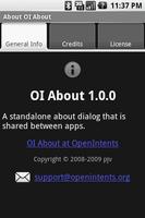 OI About is a standalone about dialog that is shared between apps. This application is invoked through the menu of other OI applications. It allows you to view version information, links, credits, and license of an application. Credits include authors, documentation, translators, and artists. All of this functionality is brought together in a simplistic and efficient layout.