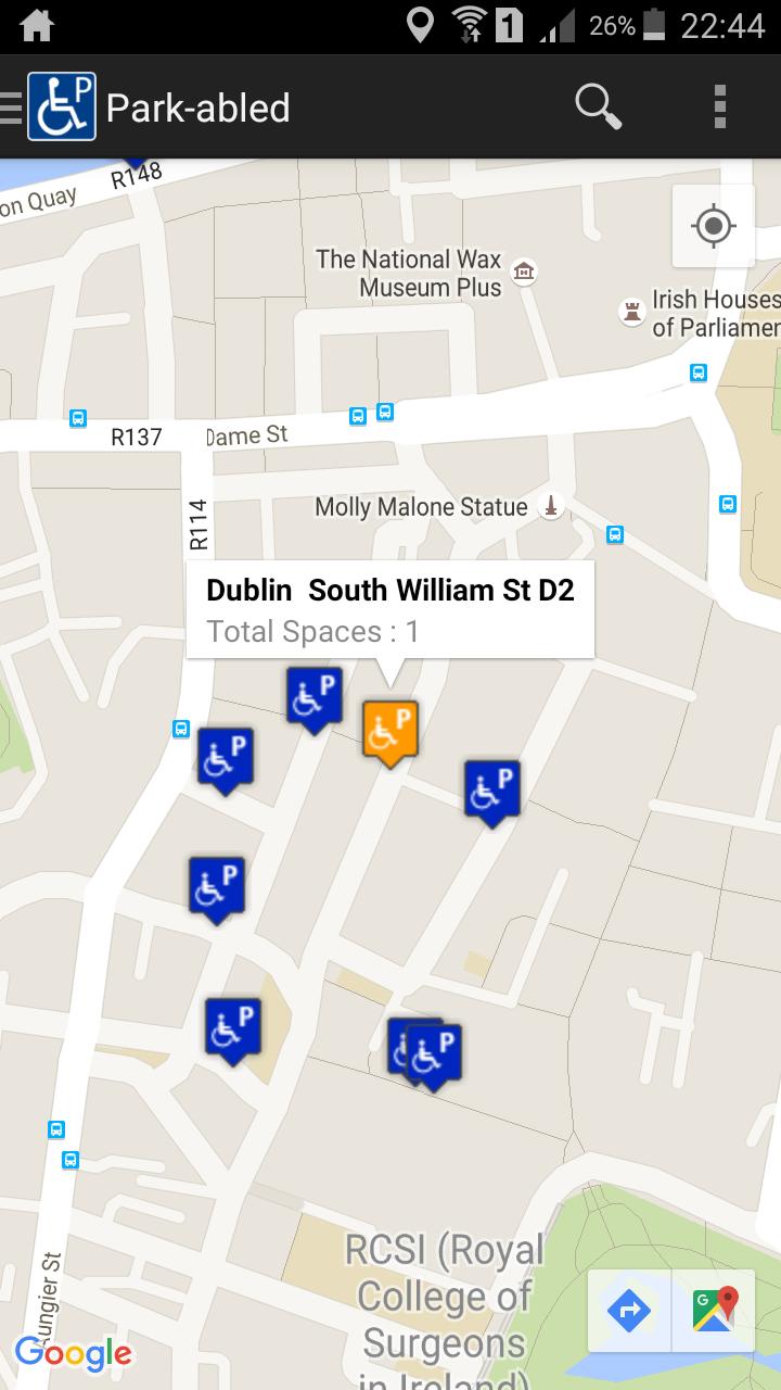 Park-abled displays the disabled parking spots in Ireland. User can click on any disabled parking spot to see the name of the spot and total number of spaces in that location. On selecting a parking spot, user will be provided with an option to start Google turn-by-turn navigation to the selected disabled parking spot.