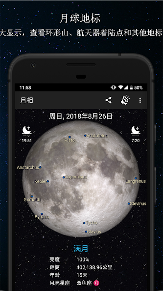 - View craters and moon landing sites: Pinch-zoom the Moon to see a full lunar atlas with spacecraft landing sites, mare, and large craters