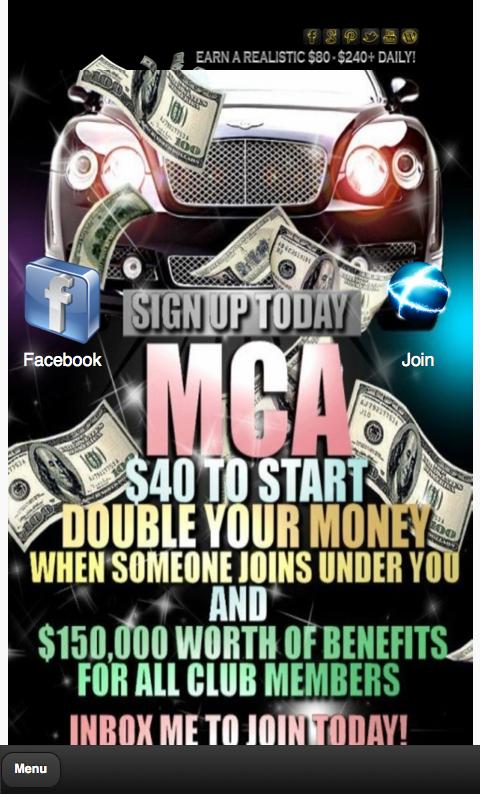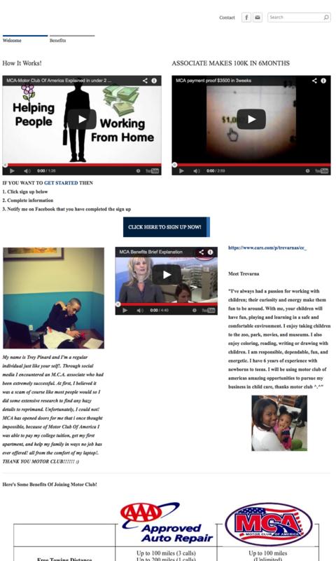 In other words, if you have 5 friends and you invite them to join your business by paying their $ 39.90 (membership) you will receive $80 for each friend making that $400. Think about it? How many people have a Facebook? Millions. Some of our members manage to Refer 10+ people weekly just on Facebook (80x10=$800) .You can work from home, from your bed, or from your toilet! Where ever you have internet access.I will explain to you how it all work's. Motor Club of America offers services such as Road Side Assistance, Legal Representation, Discounts on Travel, etc (these are just a few). For example, let's say you are driving and your car breaks down, MCA will dispatch a Tow truck to come assist you FREE OF CHARGE. Also if you get pulled over by a police officer and get a traffic ticket , MCA will hire an Attorney to represent you in court Free of Charge. Even though the MCA membership offers many benefits, I know you are here because you want to earn money working from home right? Now, in order to have the MCA benefits and be ELIGIBLE to get paid with MCA you must be an ACTIVE member. To become a member you must invest $39.90. This will cover your MCA membership for 2 MONTHS, then it's just $20 a month to keep your membership ACTIVE. Would you mind paying a lousy $20 a month when you can easily earn $500-$1000+ each week? $20 is pocket change. Here comes the BEST PART. you make your own hours and be your own boss. MCA can be promoted in any social website such as Facebook, Twitter, and Instagram. And this reaches out to everybody in the U.S & Canada... that's about 400 million people...and its $80 each time you sign somebody up...SO YOU DO THE MATH!! Not only will I be here to help you every step of the way.. but my team will also provide you with training once you get started!