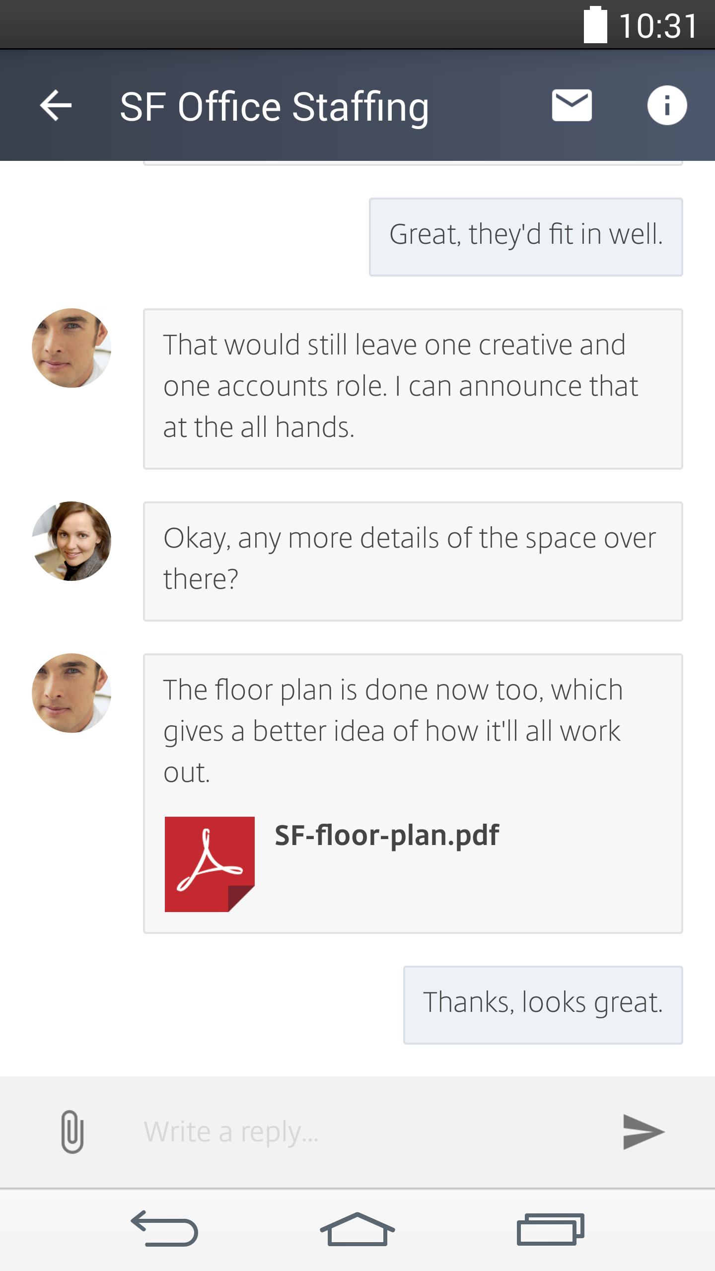 • Seamlessly move between Chat and the full Podio Android app for a quicker chat experience.