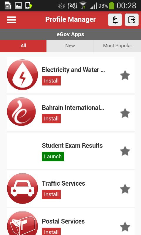 This App is a launch pad for all other live apps managed by Bahrain eGovernment Authority. App will list the eGovernment Apps and their installation status on the given device. If not installed it will have the “Install” option to direct the user to App Store for downloading and installing the app from iTunes