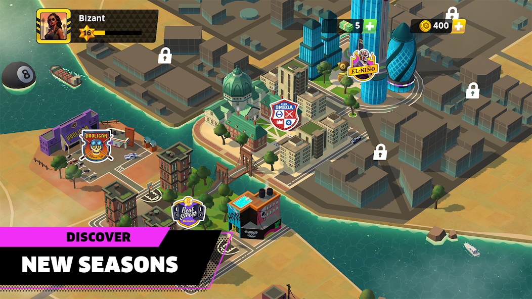Engage in seasonal challenges set in a dynamic city environment. The city is divided into areas or pool clubs, to become a champion in each club to progress to the next level. Your ultimate goal is to challenge and defeat the city's boss to become the grand master. Can you dominate in this 8 ball pool game?