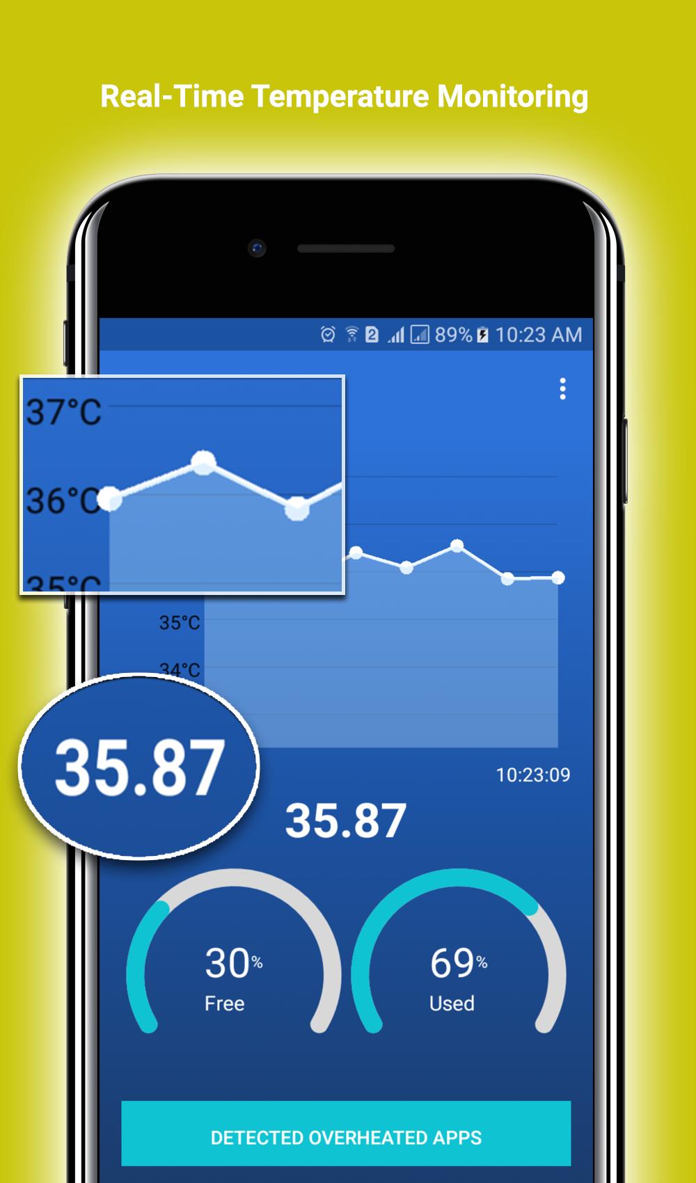 Seu algoritmo inteligente de refrigeração e minimização de calor é altamente eficaz para aumentar a duração da bateria em uso pesado e melhor desempenho na multimídia e no uso de jogos para reduzir a eficácia dos dispositivos de aquecimento. O aplicativo mestre de calor acelera o dispositivo de armazenamento e aumenta a eficiência.