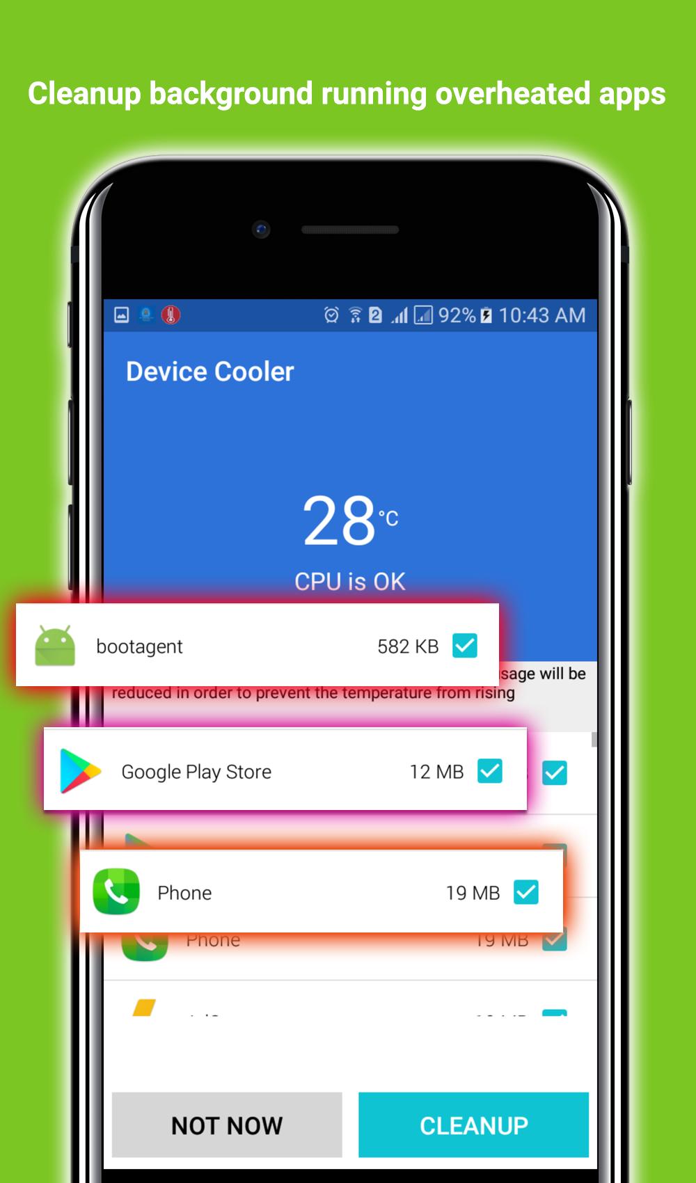 Minimizador de calor de dispositivo inteligente ou em outras palavras Funções mestre do Smart Fast Cooler Limpe as aplicações de hogs de bateria, libera RAM durante tarefas tediosas e gerencia as tarefas de acordo com o consumo de memória para minimizar e reter o resfriamento do sistema, permitindo que os dispositivos executem a uma taxa ideal por um tempo mais longo. Alguns aplicativos tendem a usar a CPU por muito tempo no fundo do fundo, o que faz com que o telefone Android produza um quente excessivo e aumentará a temperatura do telefone. O refrigerador de telefone é um dispositivo de resfriamento para o seu Android. Agora você esfria a temperatura do telefone, resfriar o dispositivo, a bateria mais refrigerada e a CPU resfriada com a ajuda do aplicativo de Device Cooler e não um jogo mais frio. Este aplicativo de resfriamento do sistema é usado para moderar o calor do dispositivo e minimizar a temperatura do dispositivo. Ram Cooler para liberar e legal RAM Memory. O aplicativo reduz o aquecimento e detecte os aplicativos em execução lentamente.