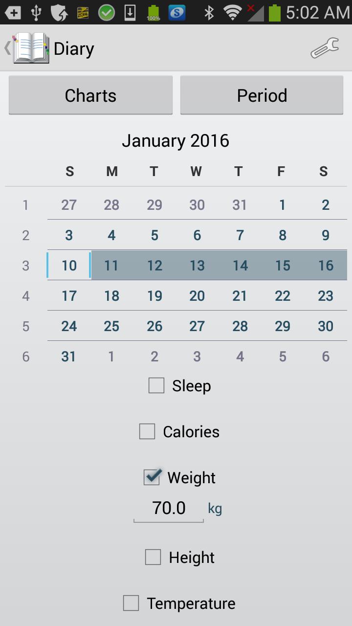 Com o diário de saúde, você pode salvar vários parâmetros médicos diariamente. Inclui: freqüência cardíaca, pressão arterial, peso, altura, sono, calorias, glicose, temperatura e período. Também pode ser usado como um rastreador de período. Todos os dados médicos podem ser exibidos em um gráfico de tempo.