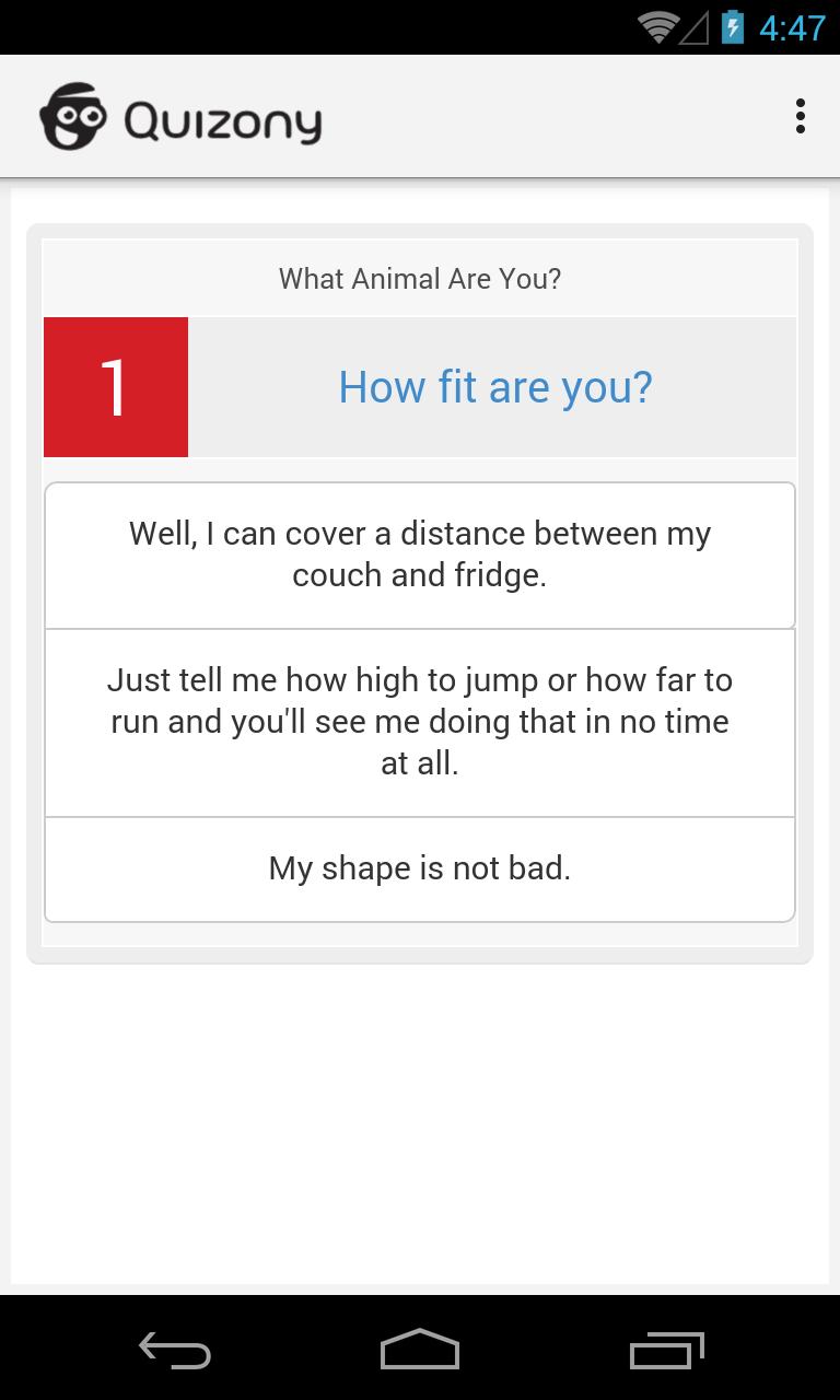 Quizony tem mais de meio milhão (e contando) os fãs do Facebook de nossos divertidos testes de personalidade para um deleite com este novo aplicativo móvel que leva o formato bem amado do site do nosso questionário de personalidade e o traz para as pontas dos dedos do seu dispositivo móvel, facilitando o que nunca faz e compartilhar nossas questionas de personalidade divertida. Assim como o nosso site, que apresenta testes de personalidade para meninas, o novo aplicativo móvel tem uma página inicial e exibe os testes de personalidade recém-publicados da semana, incluindo os mais populares testes divertidos de personalidade.