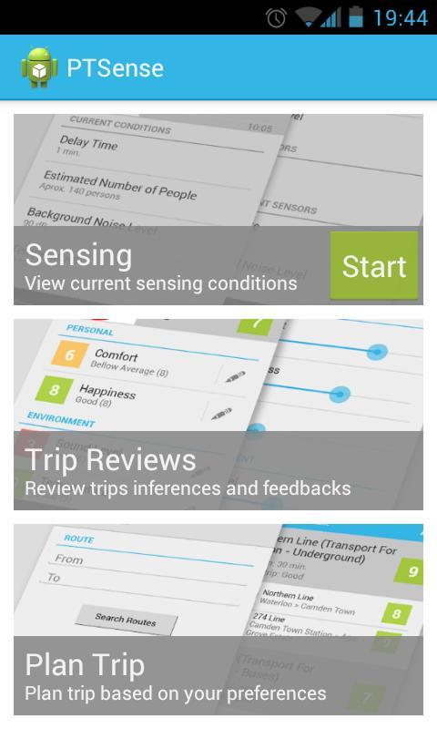 PTSense aims at improving the user experience in riding Public Transportation as a form of personal advisor. This is built on the idea that choosing transportation is more than choosing duration and cost. By knowing how you like your journeys, PTSense can suggest you better routes on your daily routines or personalize your trip planning in real time.