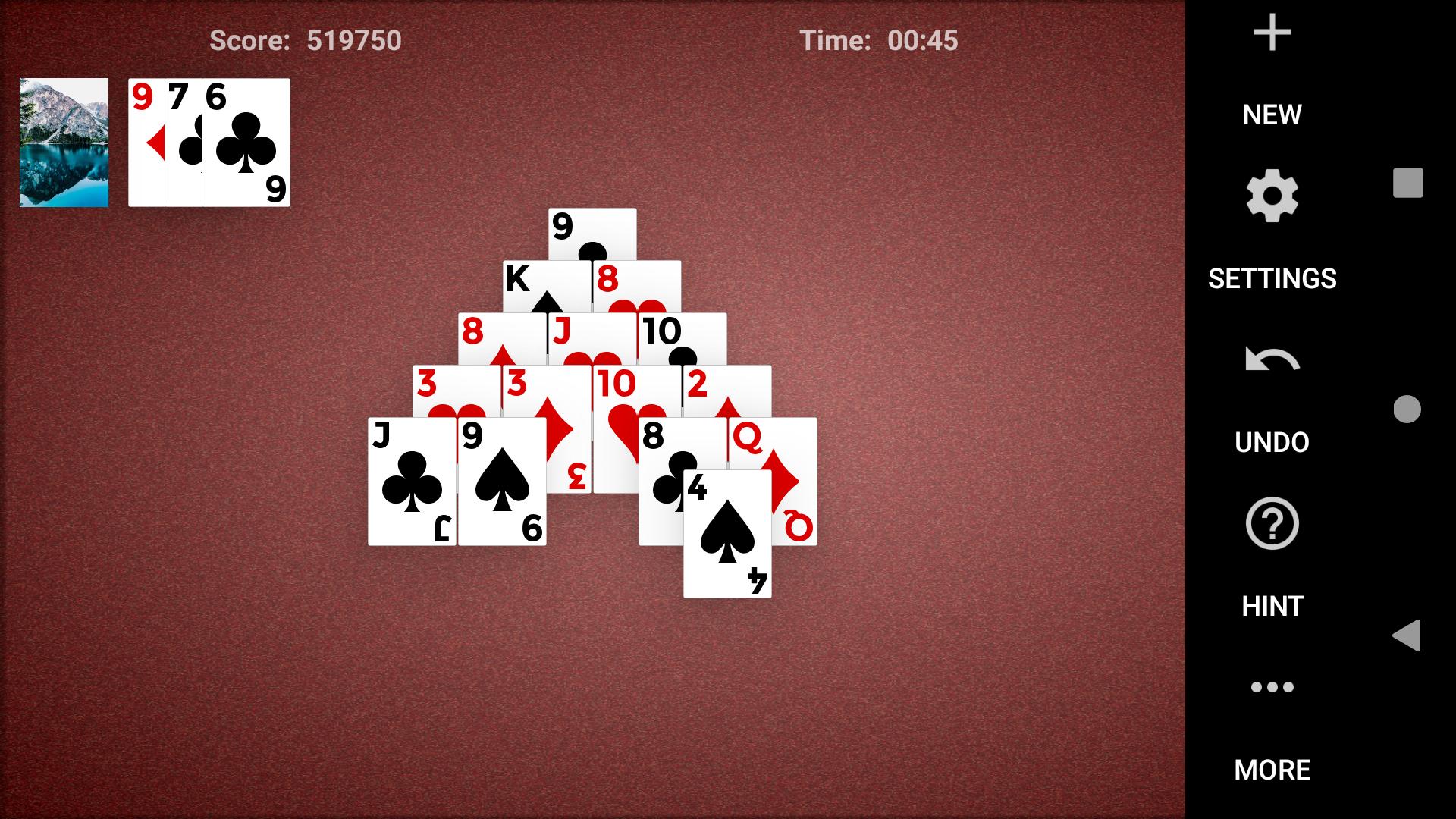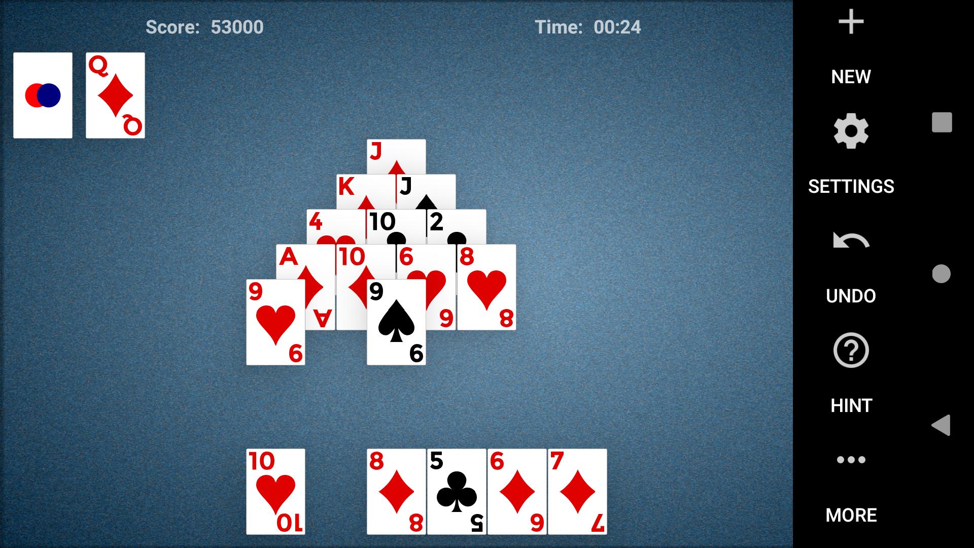 If none of the cards in the pyramid match, then you may draw cards from the card stock. However, you may only draw from the stock a limited number of times. If enabled, you may also take cards from the card reserve. Eliminate all cards and clear the pyramid to win!