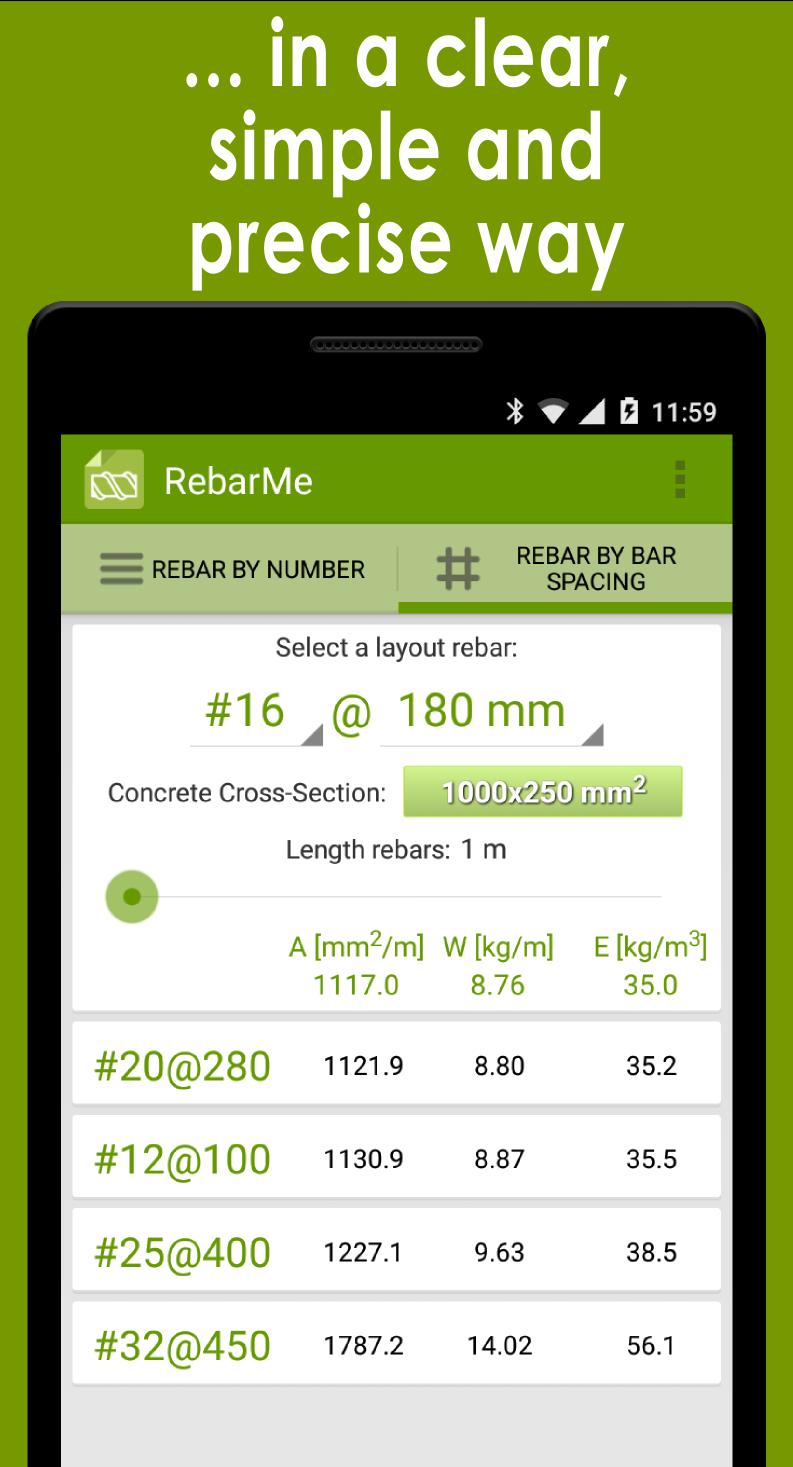 Data entry is performed in a simple and intuitive way. You can find reinforced equivalences by defining bars combinations or through the bar spacing.