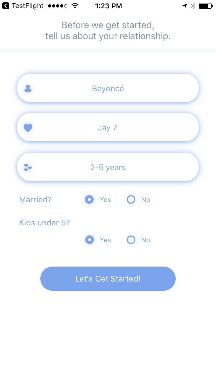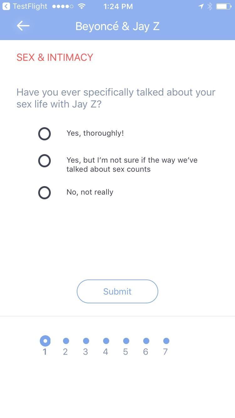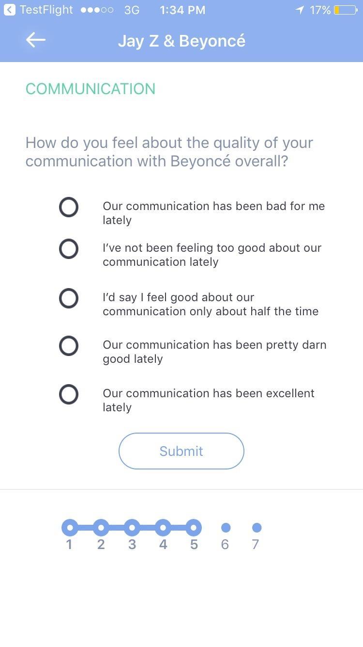 • 4 separate categories: Sex & Intimacy; Communication; Friends & Family; Money & Lifestyle. Separate feedback for each category so you can focus on the particular needs of your relationship