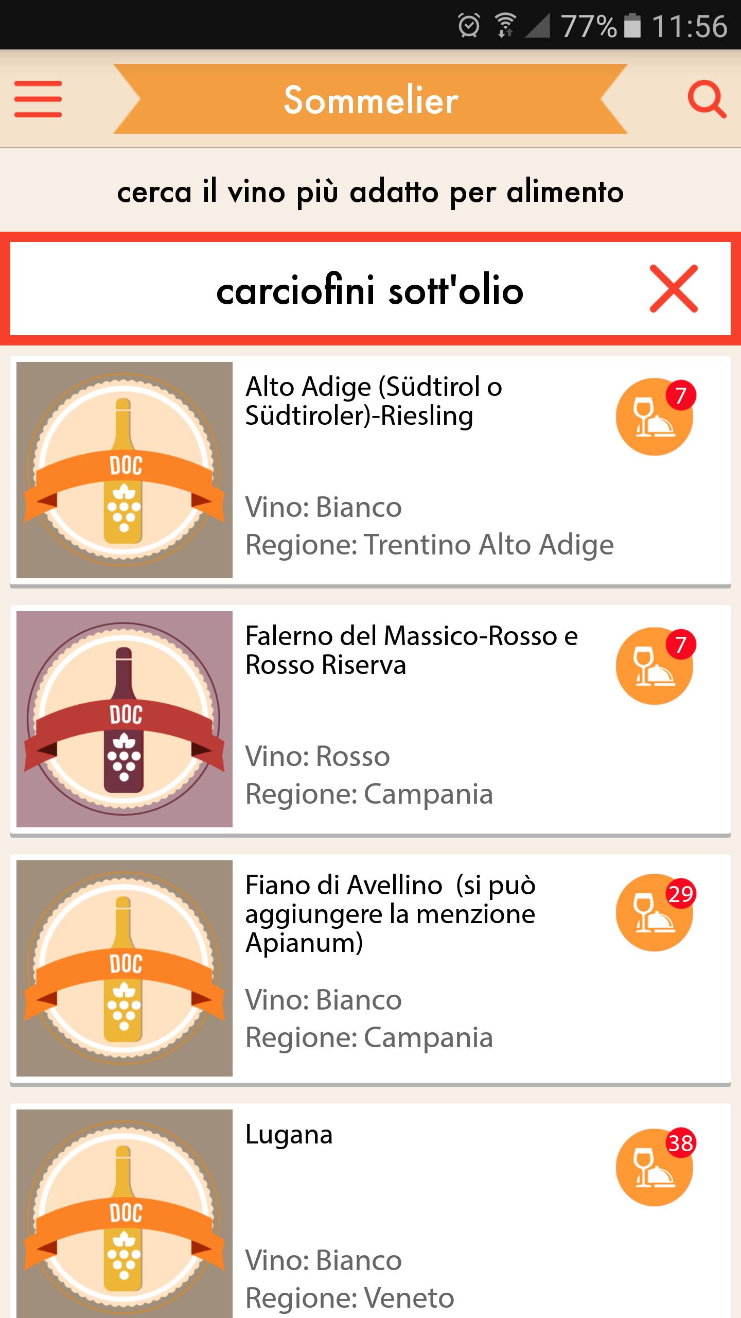• The Sommelier section with the most important information on all Italian DOC (like the vine, the area of origin, colour, flavour, alcoholic degree and foods with which they match better) and the matching recipes