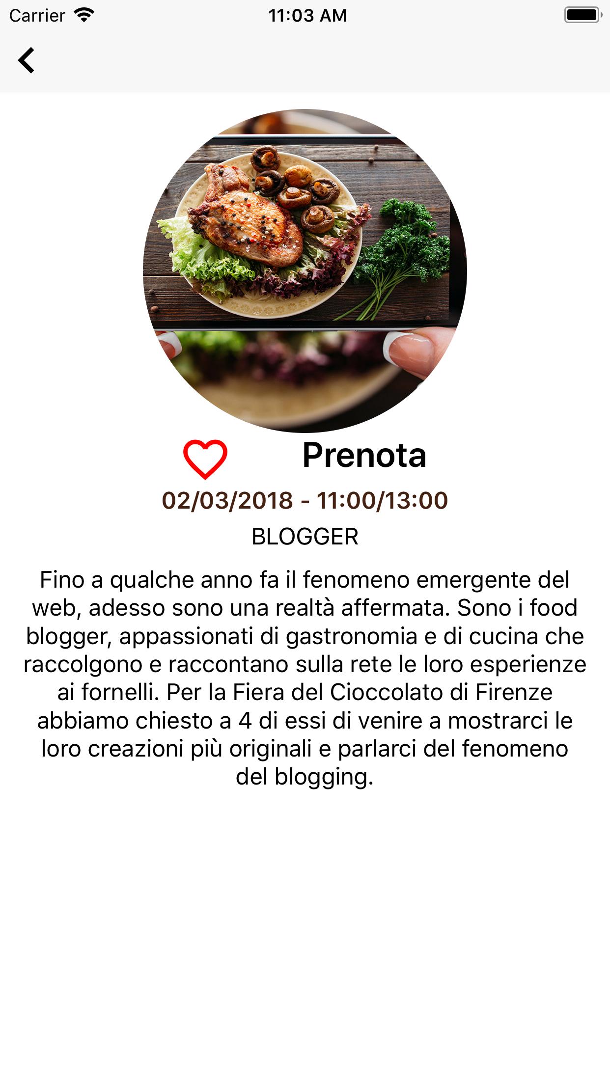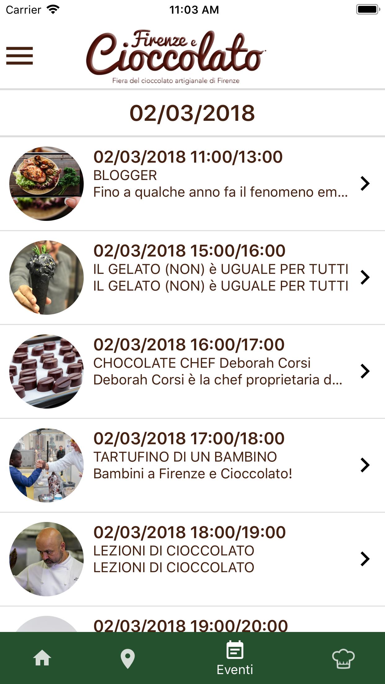 Список событий заказан по дате и сгруппируется днем, выбор события открывает экран подробно -подробно, нажимая на значок в форме сердца, вы можете добавить свое любимое событие в свои любимые, приложение напоминает вам о событиях, которые вы предпочитаете, уведомив один день и час до даты и добавив их в календарь. Можно удалить событие из ваших любимых. Также можно забронировать на событиях, через кнопку «Книга» с формой бронирования. Если персональные данные уже были введены из меню «Персональные данные» в убирающемся меню, форма уже будет заполнена. Введенные данные также появятся на странице «Персональные данные» и будут подлежат правилам политики конфиденциальности Firenze e Cioccolato .