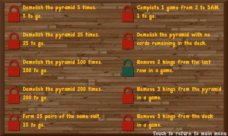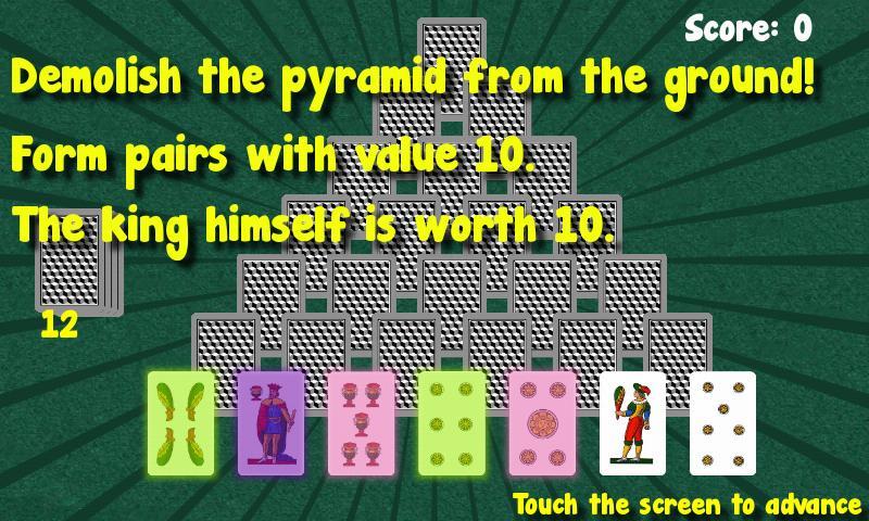 Цель игры состоит в том, чтобы снести пирамиду с земли, образуя пары со значением 10, также используя карты из колоды.