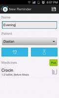 * Medicines manager: Add new medicines so you never have to re-enter medicine details for each reminder. Also use the current quantity and minimum level to know when medicine needs a refill.