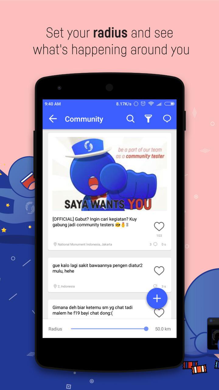 Saya provides a fun chatting platform that allows you to discover new friends within your radar. The location-based function is enhanced with an option to go anonymous, allowing you to liberate your thoughts without worrying about being judged.