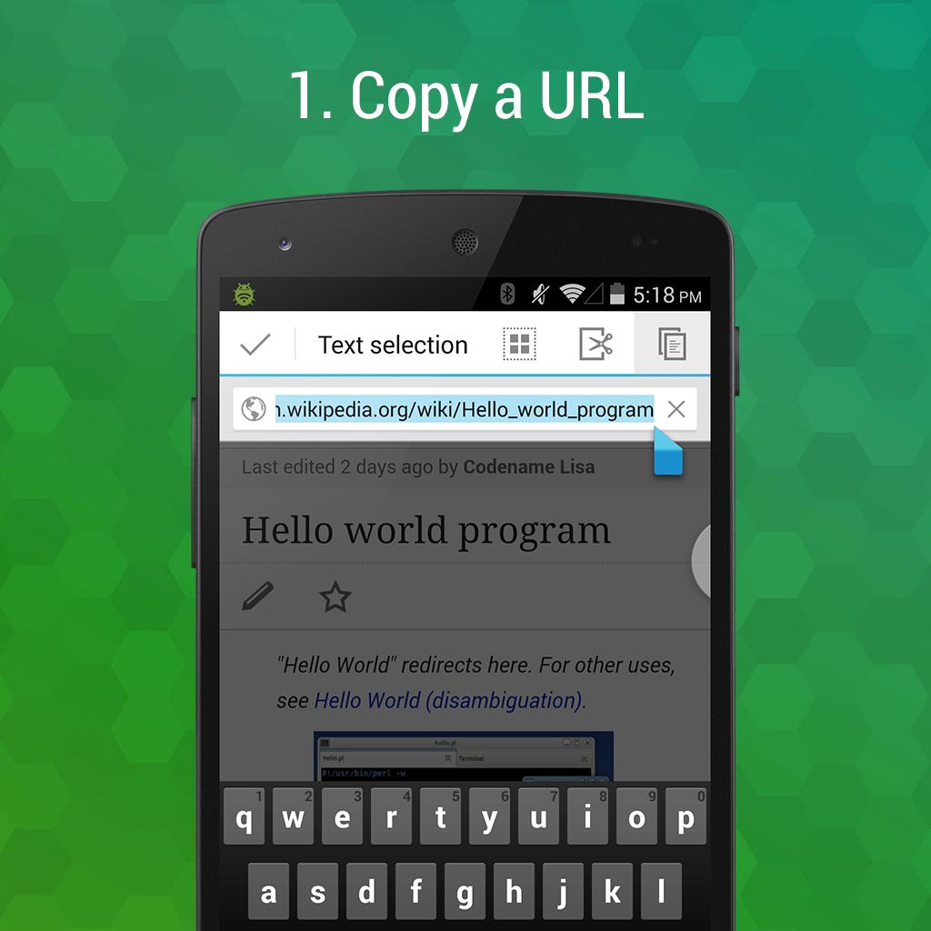 Tired of sharing long, nasty URLs? ShortPaste immediately shortens URLs after copying them (from an app such as Chrome, YouTube, Newsstand, etc) in the blink of an eye. Like magic, your long URL will appear in its shortened form when pasted. Supports bit.ly and goo.gl.