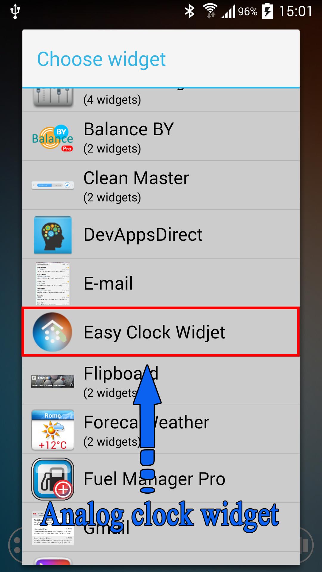 Click and hold on the Home screen, the upper part of the screen-> Replace-> Widget-> will choose Easy Clock Widget.