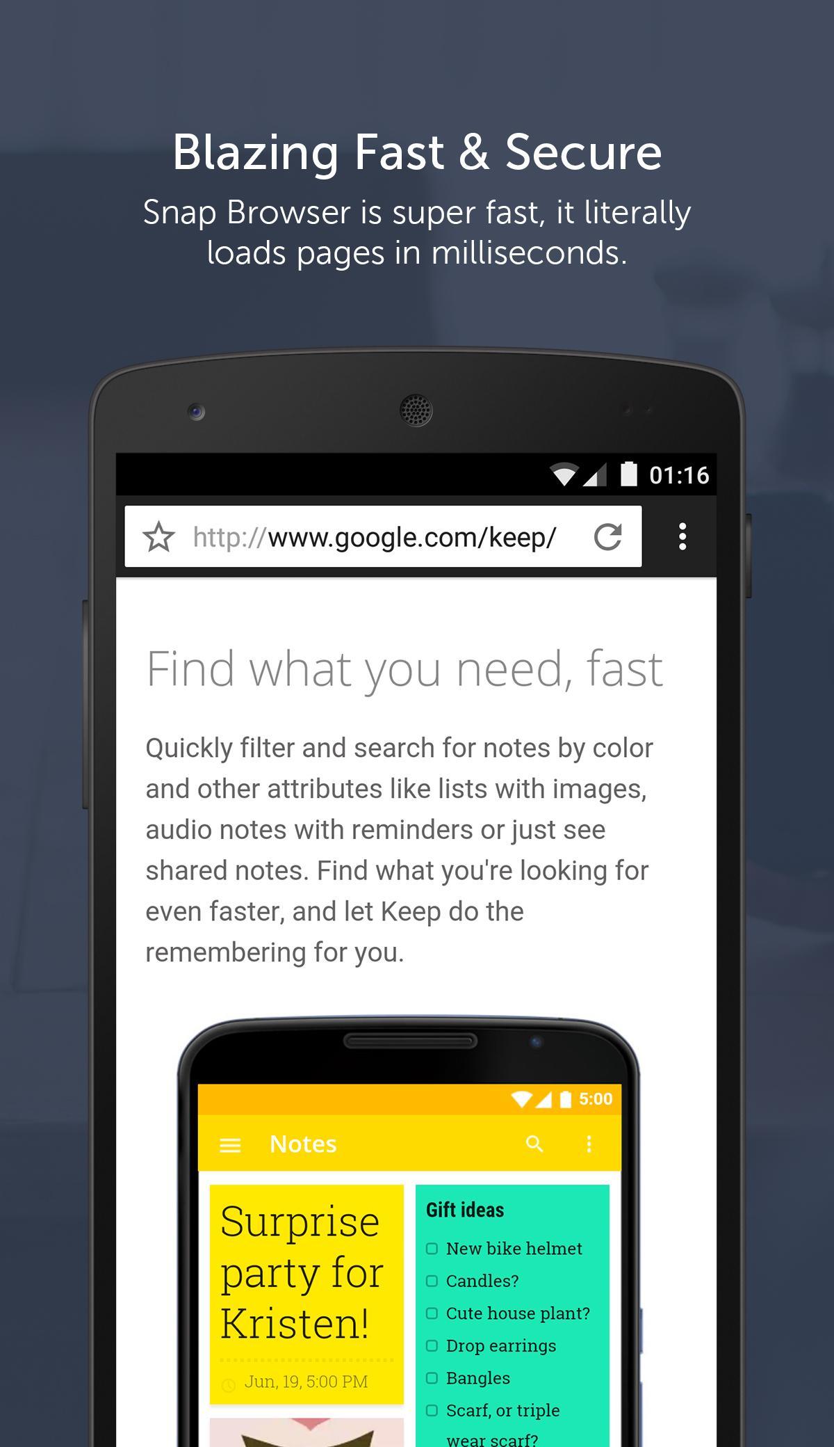 Snap Browser fully supports the latest web standards scoring high on compatibility benchmarks, compared with other well known web browsers, Snap loads heavy webpages 5 times faster.