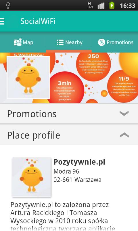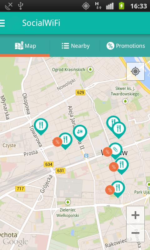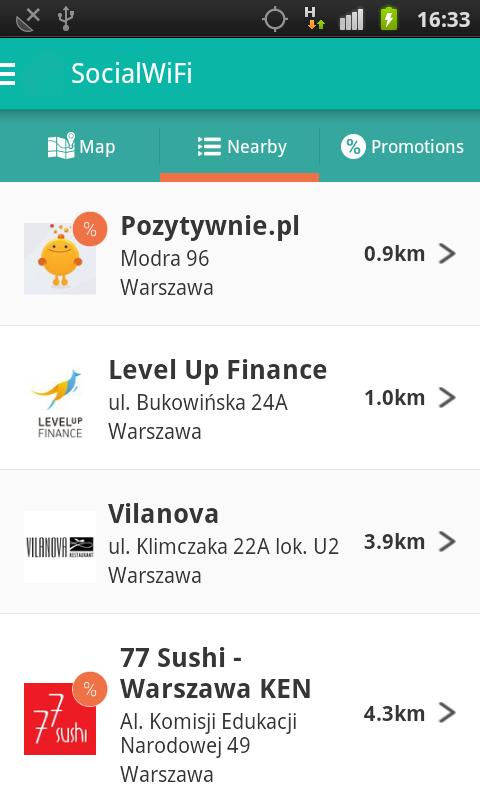 Find WiFi near you and surf the net freely. Search for promotions and offers near your place.