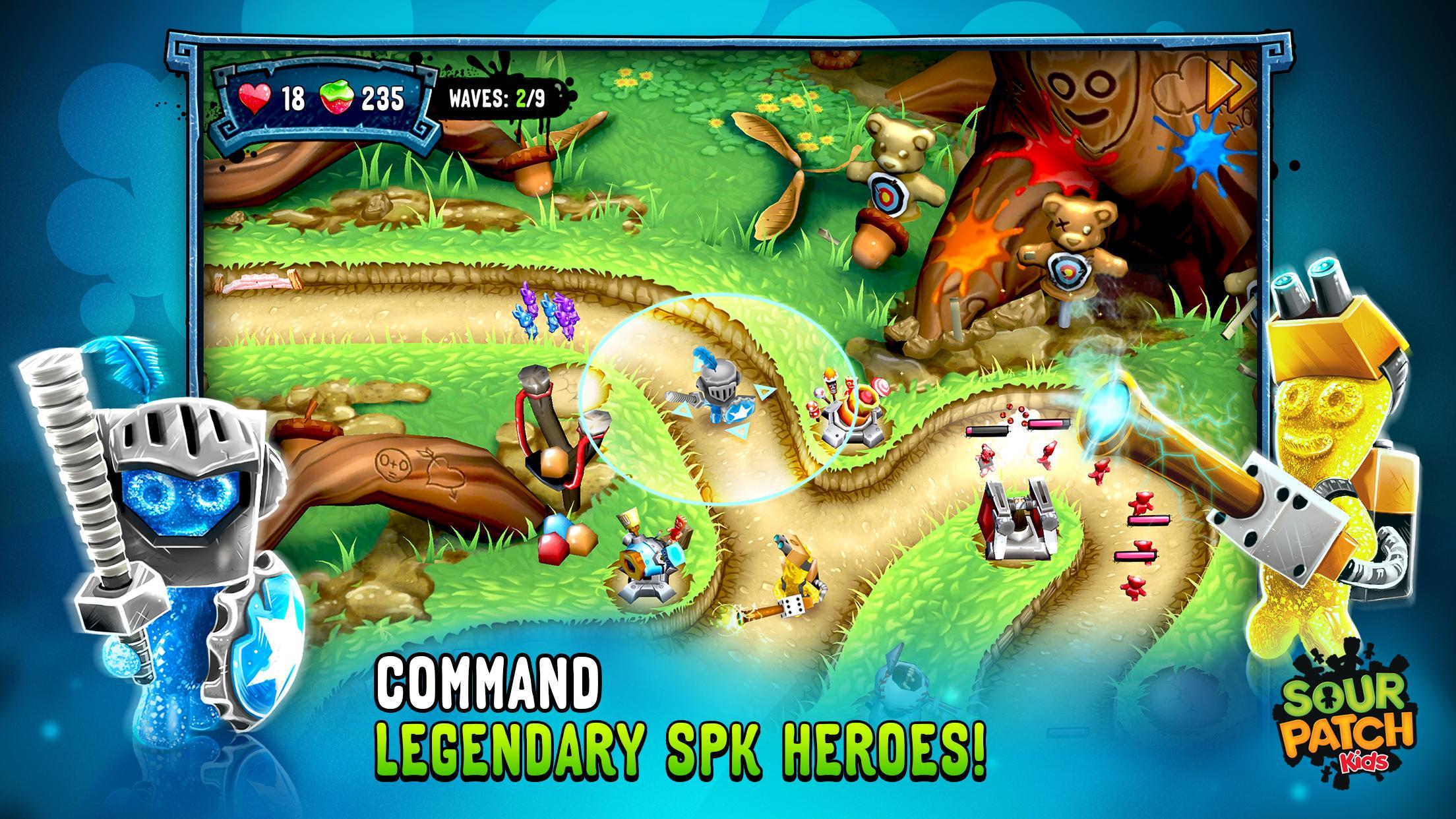 A horde of enemy gummies has invaded and must be defeated with your sour powers. Shield yourself with a coat of sour armor and defend your yard against hordes of gummy bunnies, bears, spiders and other sweet fiends using a vast arsenal of towers and heroes at your command! Fight your way through the yard, and sweeten the deal with different towers and heroes. Your gummy opponents will pucker up as you command your heroes and face legendary monsters on a mission to guard the yard from the sugary savages! Show these pesky invaders what sour coated heroes are made of! Use your sour savvy to push them back to the candy bag they crawled out for a taste of sweet victory.